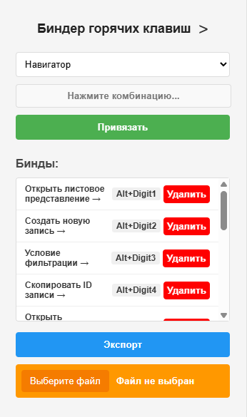 Так как “Бинды” хранятся локально, доступен импорт и экспорт этих биндов.