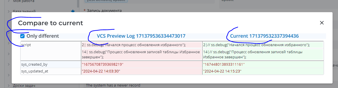 Интеграция с GIT , в модальном окне выбрать к какому продукту относится соп файл и нажать кнопку сравнения , виджет сравнивает код из сопки с дев веткой , при присутствии отличий выдает ссылку на превью лог записи с скриптом