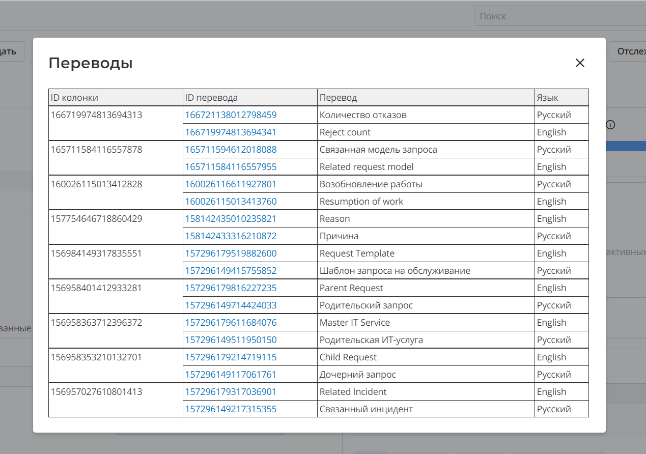 Кнопка Translations for Current Table в бургер меню - отображает все переводы к колонкам текущей таблицы
