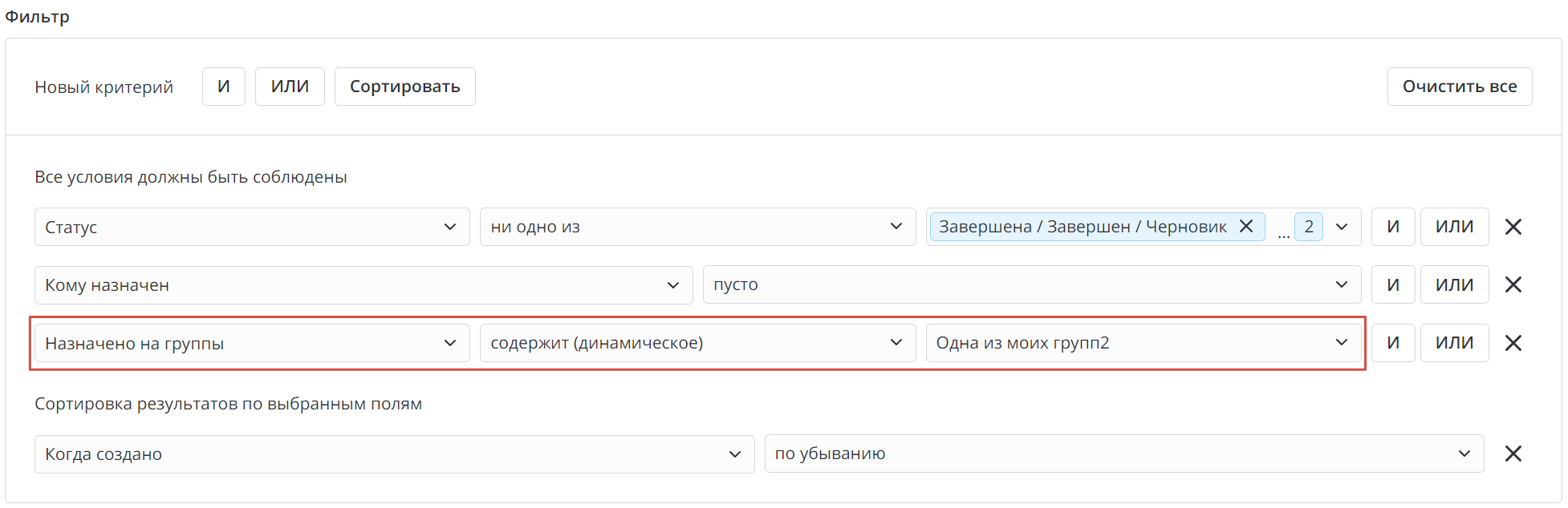 И вот проблема в том, чтобы все группы, которые назначены на эту заявку могли её видеть. Пытался это реализовать с помощью динамического фильтра в “Пункт меню”, но это не срабатывает.