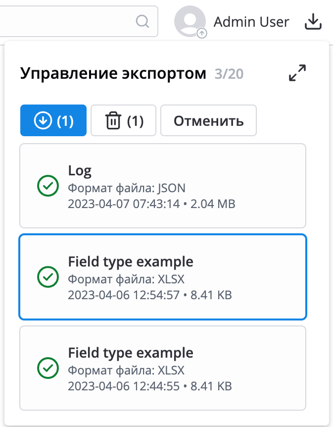 • Изменен процесс подготовки и получения файла с экспортированными данными. Теперь прогресс подготовки файла для скачивания можно отследить в виджете Управление экспортом / Export management. Файлы добавляются в очередь, общую для всех пользователей экземпляра, где остаются доступны для скачивания до тех пор, пока их не заменят следующие файлы или их не удалят вручную.