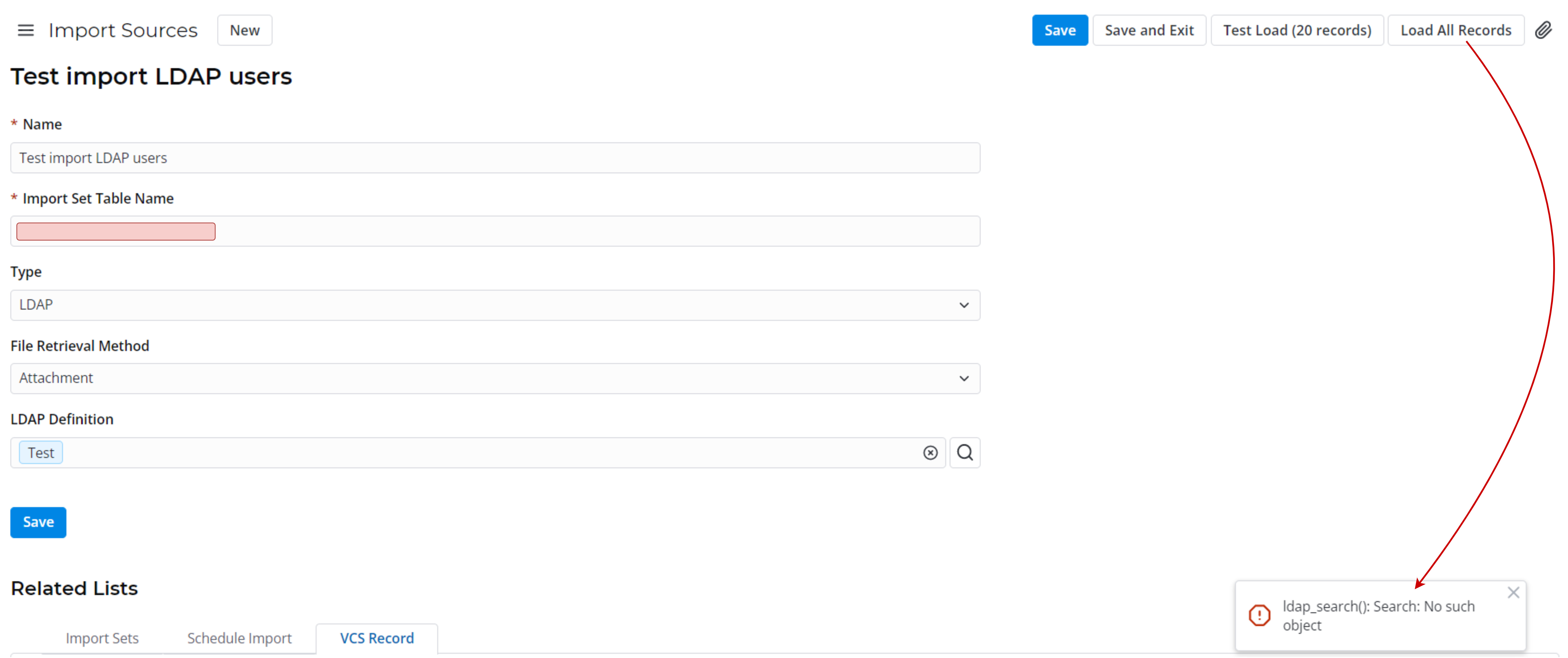 Подобная ошибка возникает в случае если значение sys_ldap_definition.rdn дублирует sys_ldap_sever.root_directory , из-за этого получаем адрес: