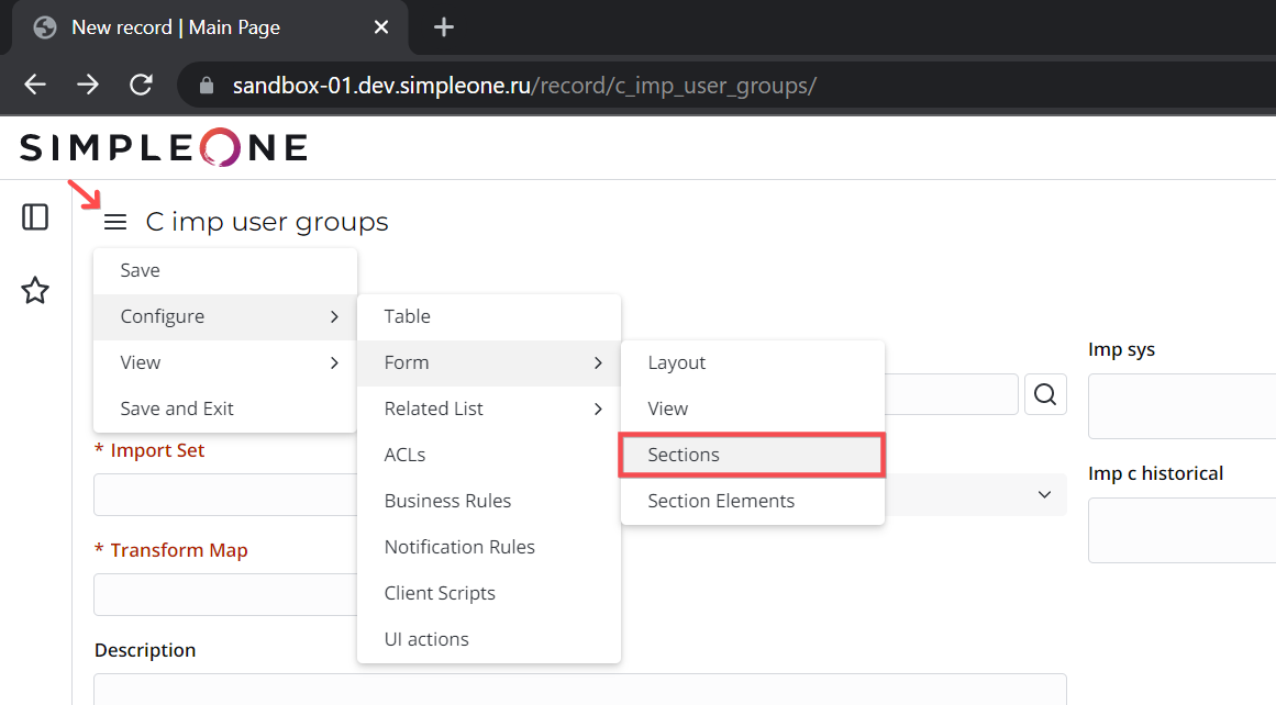 Открыть список секций sys_ui_form_section текущей таблицы через бургер меню: Configure → Form → Sections (скриншот 2)