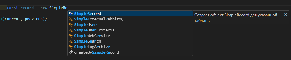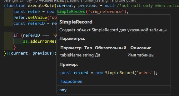 While writing scripts, the extension suggests SimpleOne API classes and methods in the auto-completion list and displays a tooltip with a brief description:
