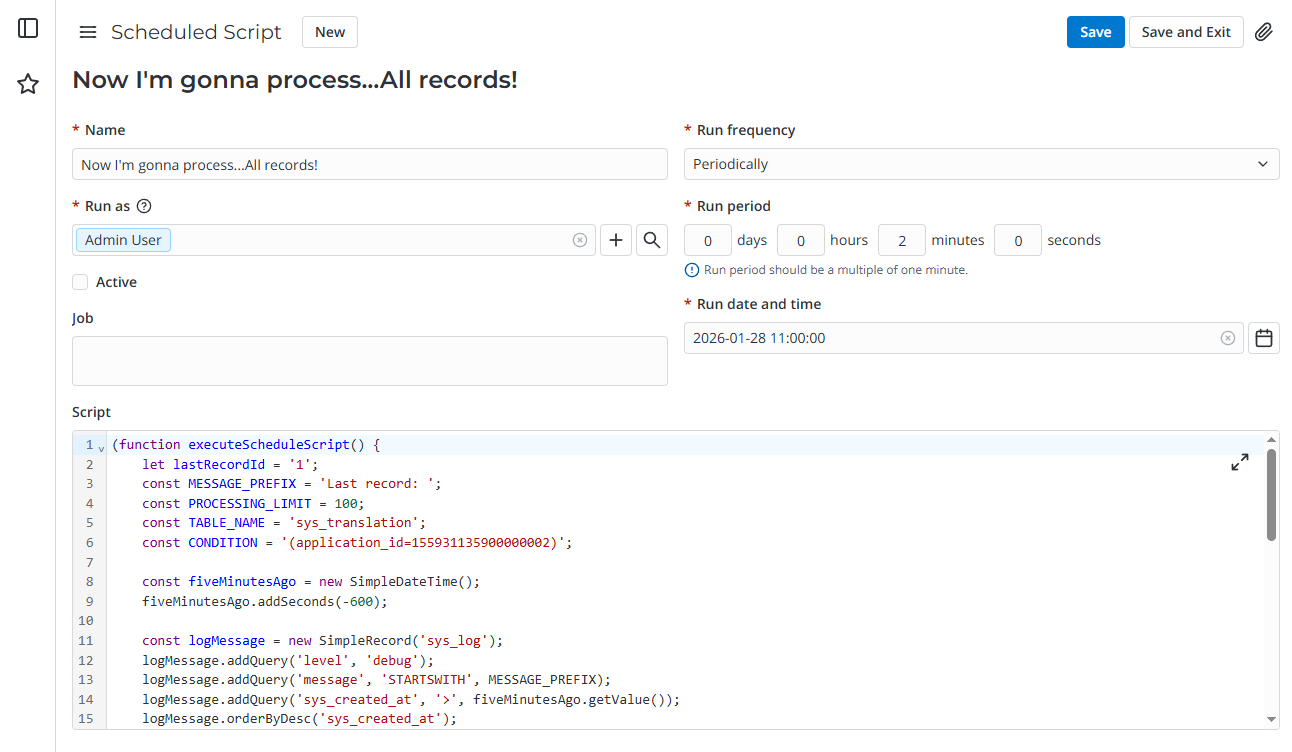 (function executeScheduleScript() { let lastRecordId = '1'; const MESSAGE_PREFIX = 'Last record: '; const PROCESSING_LIMIT = 10; const TABLE_NAME = 'sys_translation'; const CONDITION = '(application_id=155931135900000002)'; const fiveMinutesAgo = new SimpleDateTime(); fiveMinutesAgo.addSeconds(-600); const logMessage = new SimpleRecord('sys_log'); logMessage.addQuery('level', 'debug'); logMessage.addQuery('message', 'STARTSWITH', MESSAGE_PREFIX); logMessage.addQuery('sys_created_at', '>', fiveMinutesAgo.getValue()); logMessage.orderByDesc('sys_created_at'); logMessage.selectAttributes('message'); logMessage.setLimit(1); logMessage.query(); if (logMessage.next() && logMessage.message.match(/\d+/g)) { lastRecordId = logMessage.message.match(/\d+/g)[0]; } function processRecords() { const record = new SimpleRecord(TABLE_NAME); record.addEncodedQuery(CONDITION); record.addQuery('sys_id', '>', lastRecordId); record.orderBy('sys_id'); record.setLimit(PROCESSING_LIMIT); record.query(); while (record.next()) { lastRecordId = record.sys_id; // ... processing actions } ss.debug(`${MESSAGE_PREFIX}${lastRecordId}`); } processRecords(); })(); -