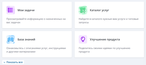 Теперь вы можете настроить переход к разделам портала через карточки нового виджета. Расположение карточек и количество, которое отображается по умолчанию на портале, определяется в настройках. Отображение карточек также адаптируется к разрешению экрана устройства и если карточек слишком много, виджет может скрывать часть из них.