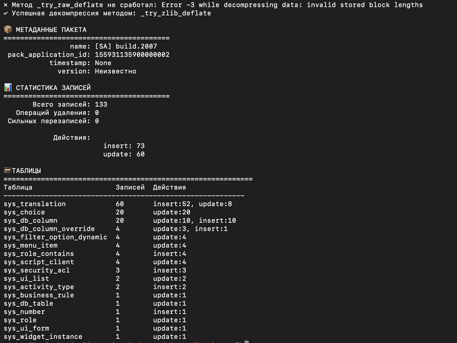 SOP Analyzer - это инструмент командной строки для анализа и просмотра содержимого файлов пакетов SimpleOne (.sop). Утилита предоставляет подробную информацию о метаданных пакета, статистике записей, таблицах и выполняемых операциях.