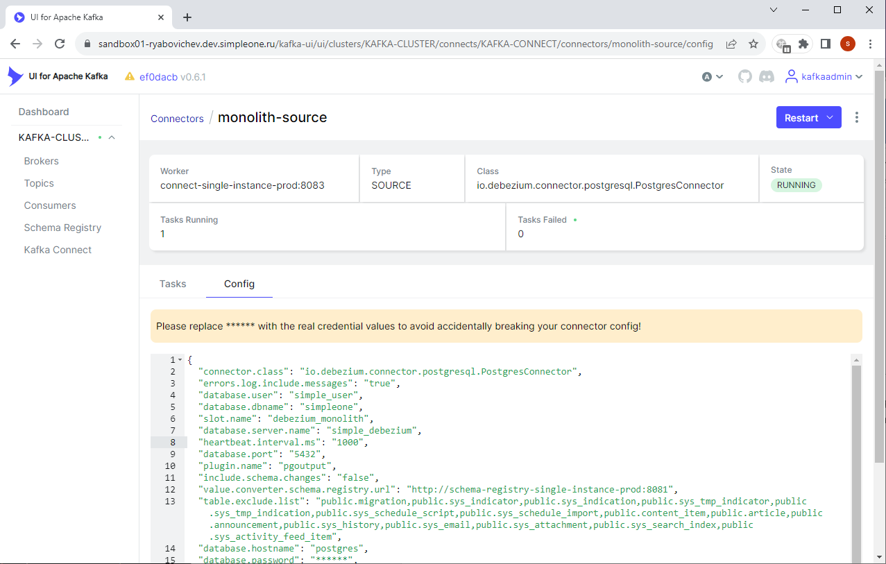 Перейти в Kafka-Connect → monolith-source → вкладка Config