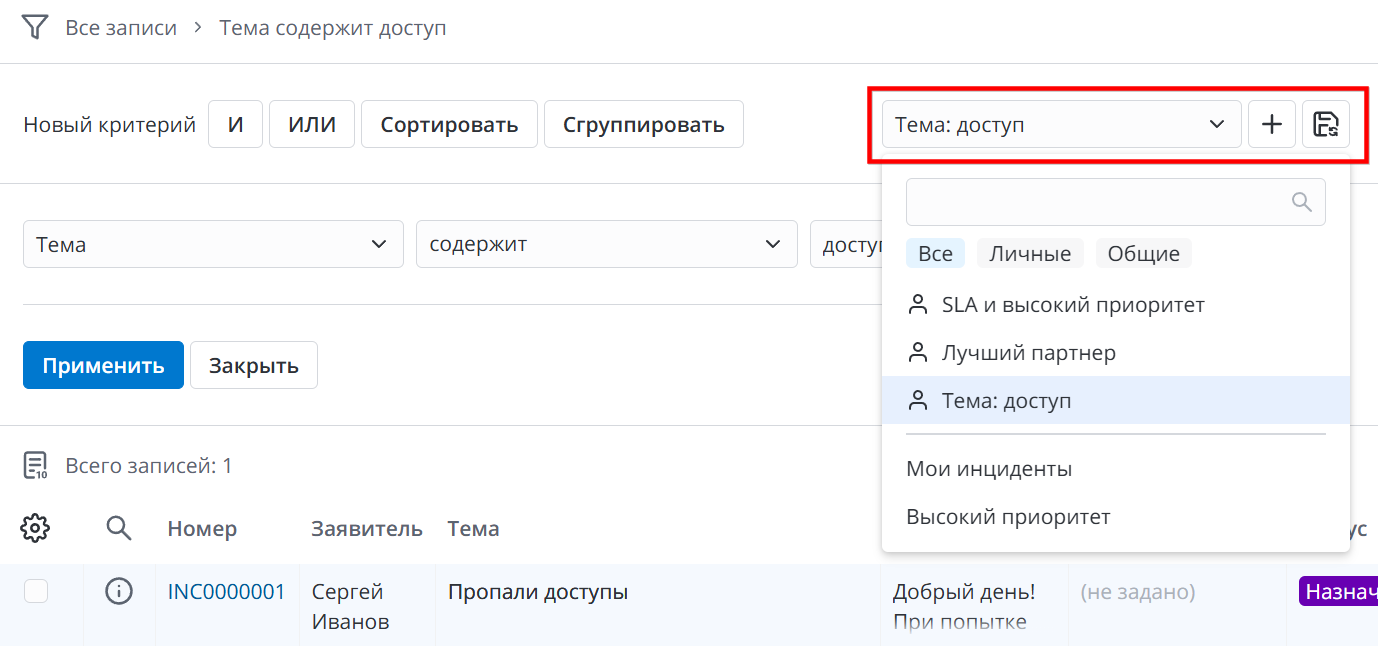 Теперь вы можете сохранять настроенные фильтры в конструкторе условий, чтобы использовать их повторно. Это позволяет значительно сократить время поиска записей по одним и тем же параметрам, когда это необходимо делать на регулярной основе.