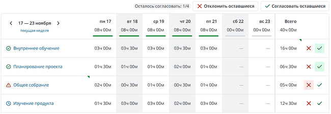 - возможность согласования и отклонения табеля трудозатрат целиком или построчно;