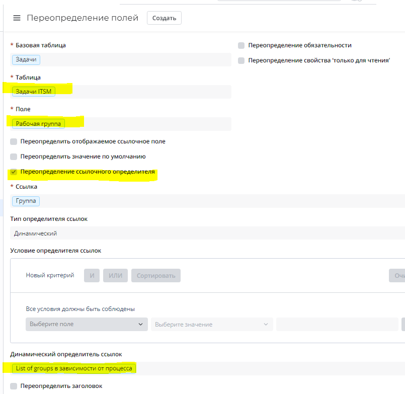 Далее для поля Рабочая группа в динамическом фильтре таблицы, как правило, Task, задаём свои условия фильтрации с учётом процесса. Т.к. нужно будет заменять вендорский скрипт фильтра (“динамический определитель ссылок”) на свой, к которому нет доступа в Task-е, используем переопределение для поля рабочая группа.