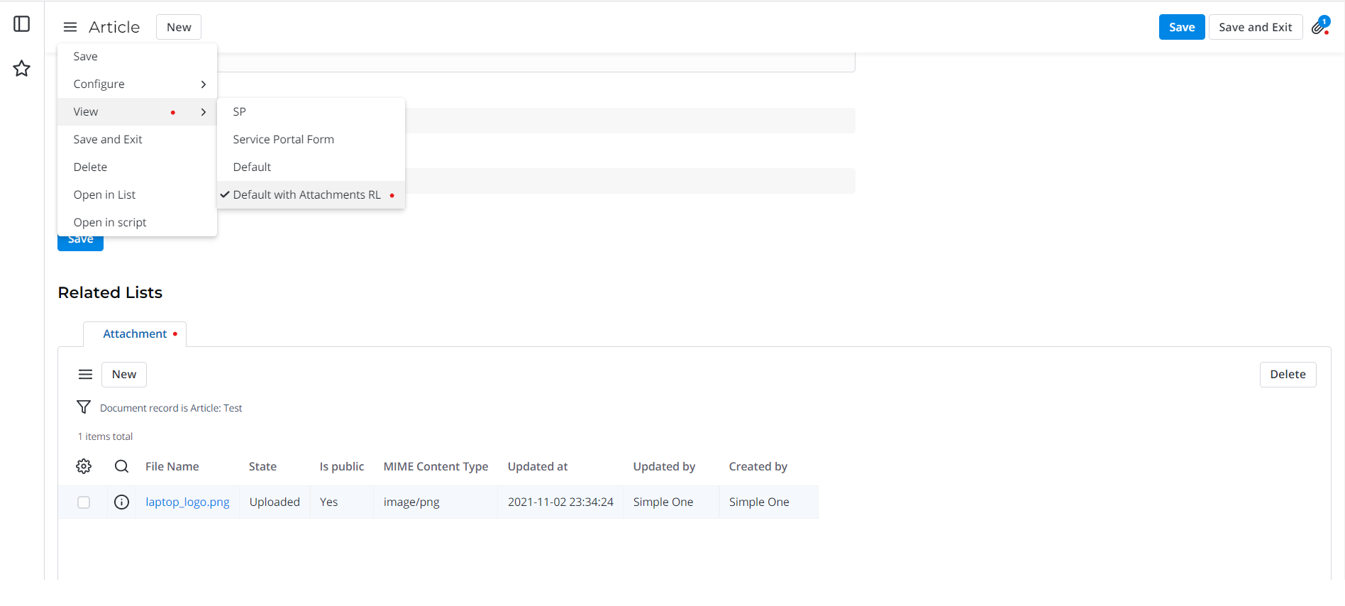 В качестве решения предлагается добавление представления формы Default with Attachments RL для таблицы article со связанным списком вложений, прикреплённых к текущей записи.