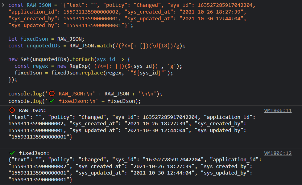 new Set(unquotedIDs).forEach(sys_id => { const regex = new RegExp((?<=": )(${sys_id}), 'g'); fixedJson = fixedJson.replace(regex, “${sys_id}”);});